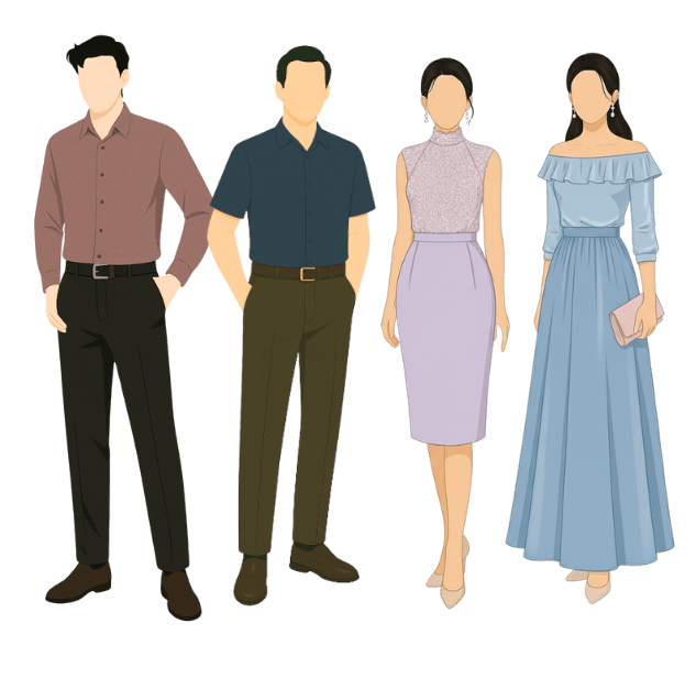 Semi-formal attire in any shades except color yellow